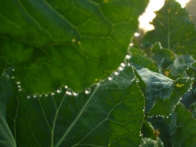 3枚目、「寒さでおいしくなる」を通り越して、傷んでしまっている、キャベツ。白菜でも同様な現象が。葉っぱの間の水滴が、凍って、圧迫して、凍傷となっている、と考えています。中心部まではそこまで凍らない、周辺部は、融ける、ということで、中間部がこうなっていると。困りものです。