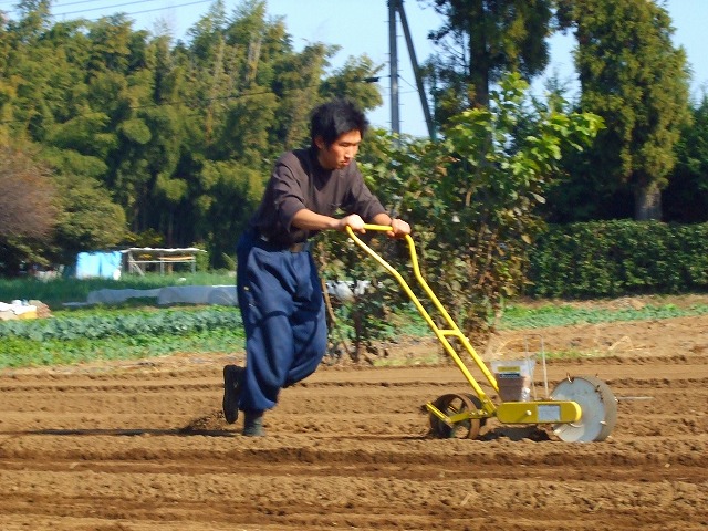 左から、メルヘンカボチャ(サカタのタネ、育苗とほぼ同時に播種)、オクラ(タキイのグリーンソード、まるみちゃん、赤まるみちゃん、直播と同時に播種)、露地トマト(自然農法センターのサンティオ、サカタのクッキングトール、タキイのクックゴールド、サカタの麗花、ウネたてと同時に播種)、雪化粧カボチャ(サカタのタネ、育苗にやや遅れて播種)。とくに、カボチャは、ツルが伸びる前に、ある程度枯れてきていないと、うまくない、というこれまでの感触があるので、早めの播種をこころがけましたが。