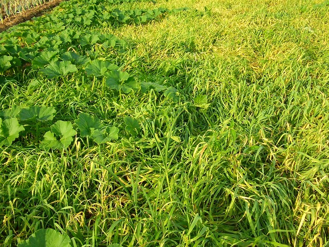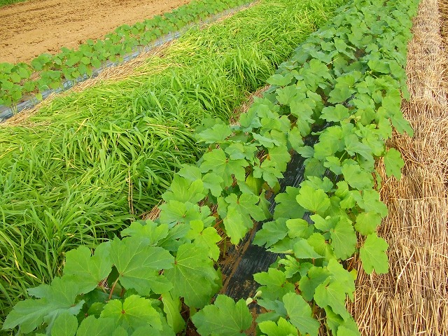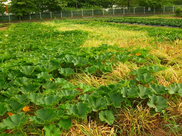 そりゃあ、麦ワラの上を伸びていくほうが、カボチャ的には快感だろうとは思うのですが。早どり用の「みやこ」と「ほっとけ栗たん」は、去年のワラの上で、もう、とり頃になっています。とりたい・・・