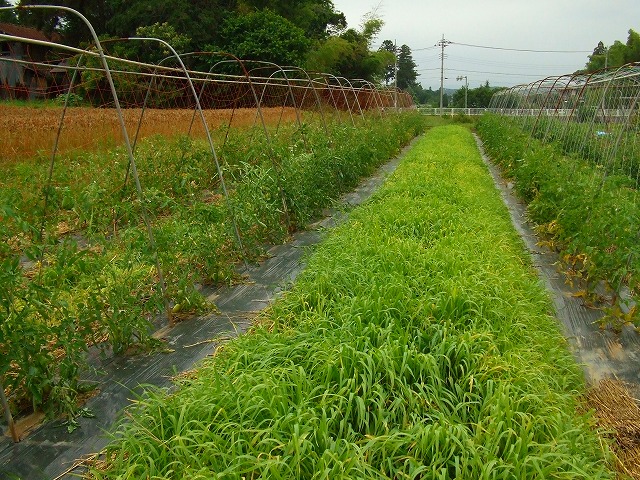 以下は、麦ワラ集め以前の「マルチ麦」(カネコ種苗の「手間いらず」というマルチ大麦、ネットで購入したら、1キロ700円ちょっとに送料かかったが、近所の「こいけや」さんに、もっと安く売っていた・・・)の様子です。今年は、省力のため、多用しました。