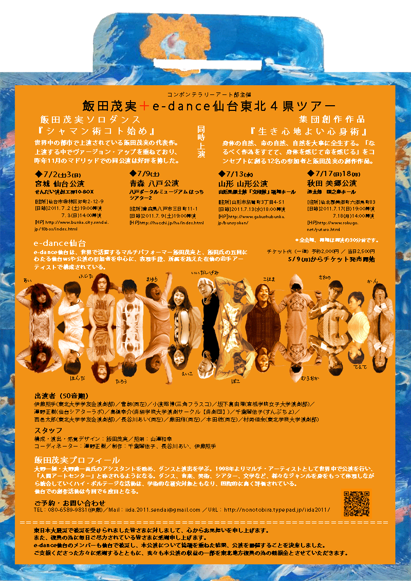 東日本大震災で被災された皆さまに対しまして、心からお見舞いを申し上げます。また、復興の為に日夜ご尽力されている皆さまに感謝申し上げます。e-dance仙台のメンバーも宮城県で被災し、本公演について協議を重ねた結果、公演を開催することを決意しました。ご支援くださった方々に感謝するとともに、本公演の収益をすべて東北地方を復興していくための義援金とさせていただきます。